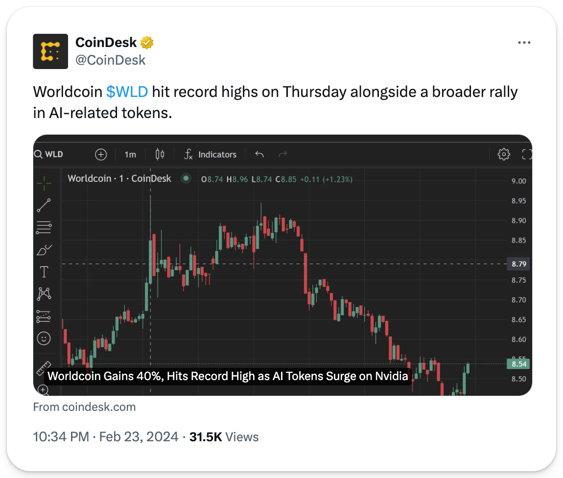 OpenAI's preview of text-to-video offering Sora, Sam Altman's theorized $7 trillion raise, and strong Nvidia earnings have done wonders for Worldcoin (WLD) in the past two weeks, up ~240% overall thanks to another ~95% boost this week.