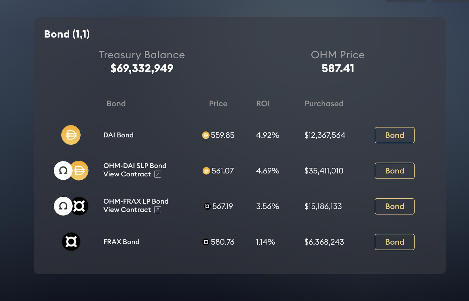 Bonding has so far been an effective mechanism for implementing this strategy, as the protocol currently owns 98.5% of the liquidity for the Uniswap V2 OHM-FRAX pair, and 99.5% for the OHM-DAI pair on SushiSwap.
