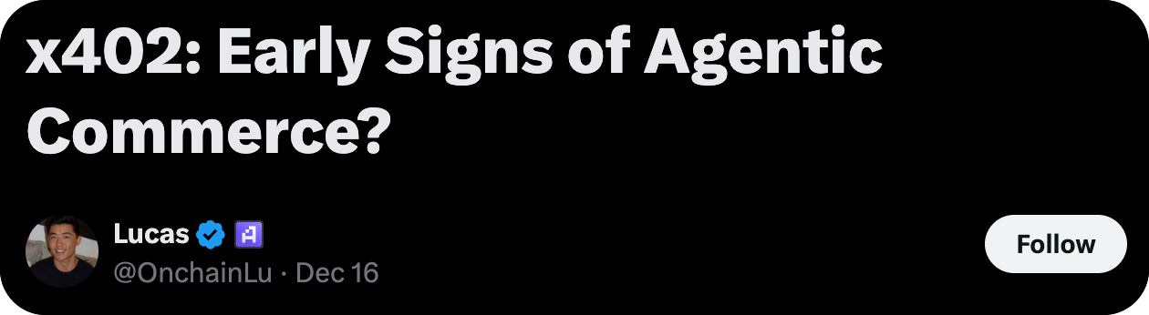In the case of x402, Lucas of onchain data provider Artemis believes this illegitimate activity to account for 47% of all x402 transactions to date, mostly from teams gaming leaderboards to climb x402scan rankings.