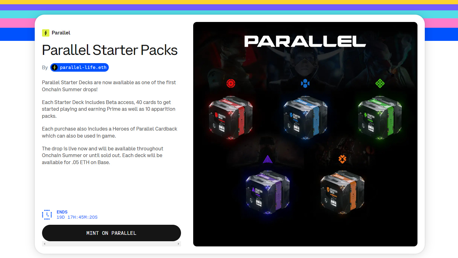 As part of the ongoing Onchain Summer festivities, sci-fi card game Parallel is dropping five different sets of Starter Decks on Base for 0.05 a pop over the next few weeks. Each deck will grant you 40 cards to start playing with + 10 apparition packs. If you’re like me and have been waiting for a straightforward entry point to start exploring Parallel’s gameplay, this is it!