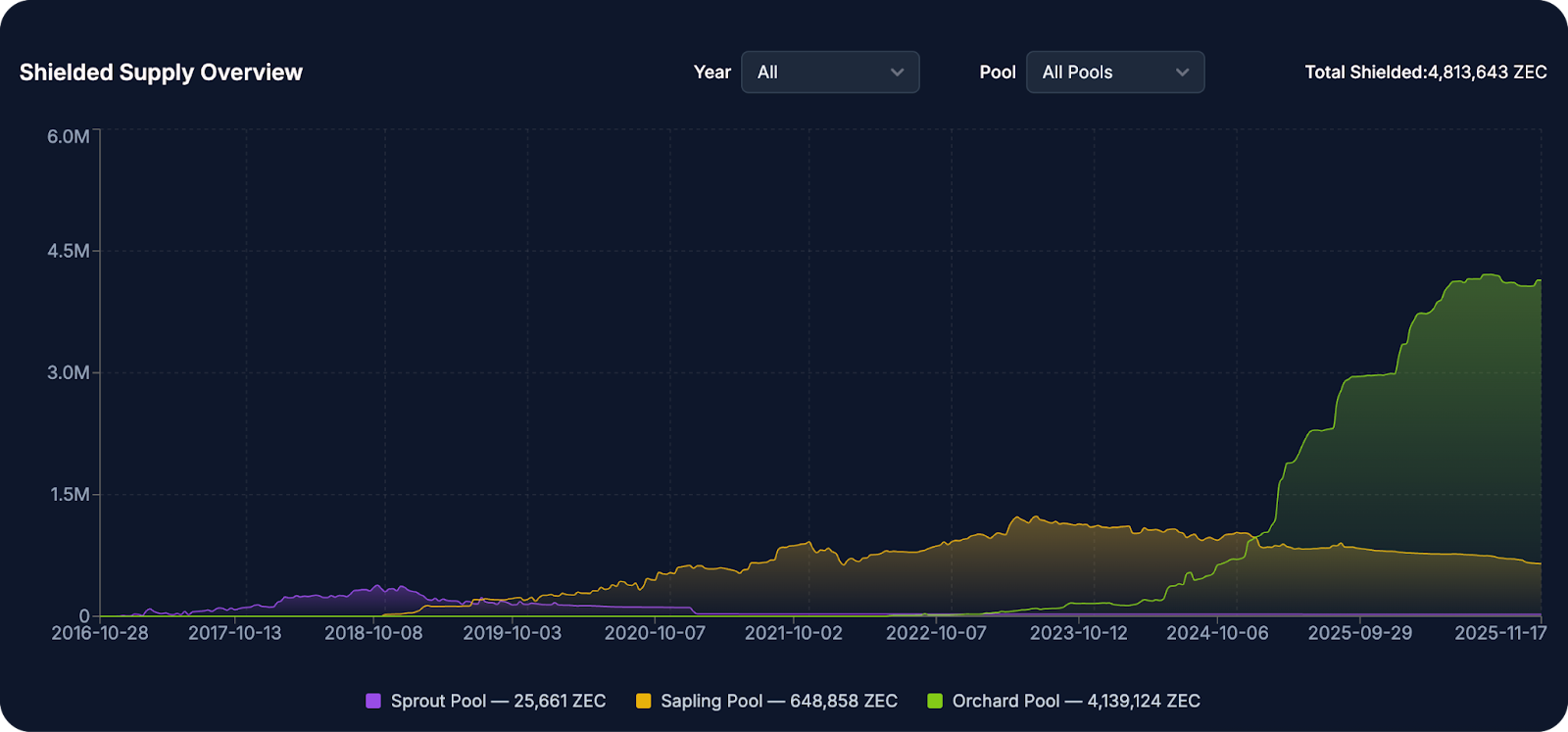 - Shielded Supply Growth: As previously noted, the amount of ZEC in the shielded pool has grown significantly over the past year, helping improve the network's overall privacy while acting as a sort of “deflationary” pressure to token supply.