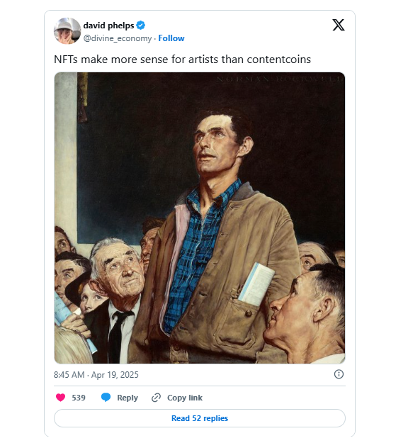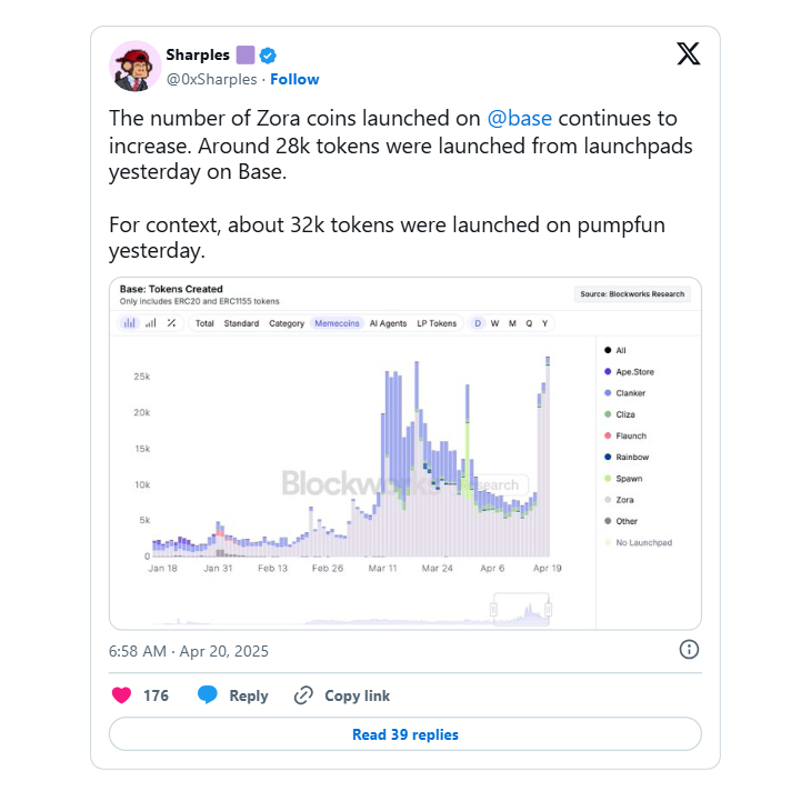 Unlike launching a traditional token, coining a post requires no pitch deck, roadmap, or community building. It reduces the mental overhead. That can lead to more people experimenting, minting things they otherwise wouldn’t. In this view, more coining means more cultural exploration.