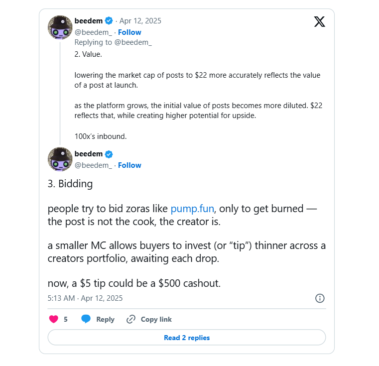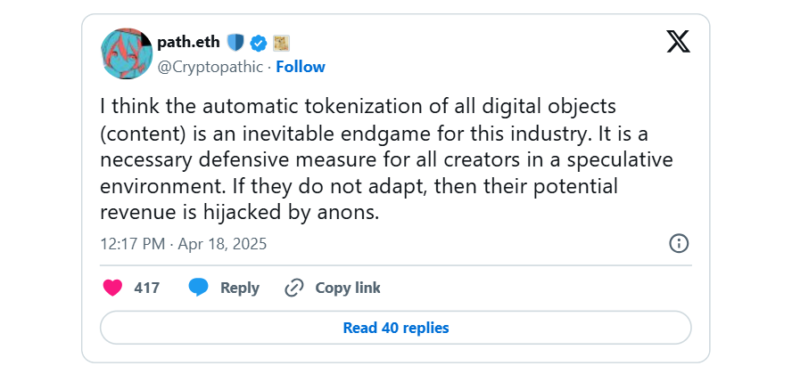 Ultimately, they offer a more liquid and market-friendly way to collect media compared to NFTs. And for creators, they present a path to earn directly from trading fees based on how much attention a given post generates.