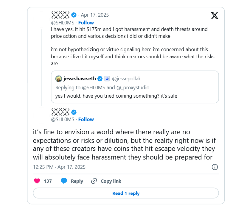 Because we’re still at the start of the memecoin age, many traders treat content coins like projects and expect roadmaps, engagement, and value accrual. That can put creators in an awkward position, e.g. if you mint a one-off piece of content and suddenly strangers are aggressively demanding to know how you plan to get the coin price up, etc.