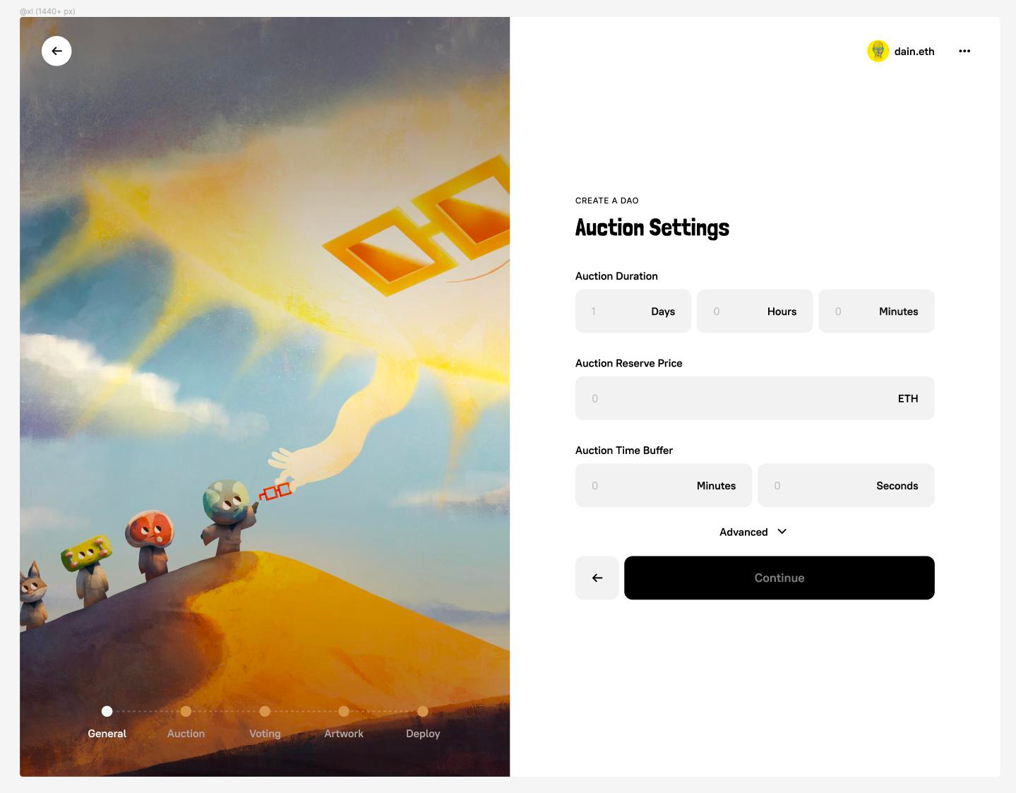 All the technicalities of the process are abstracted away under the hood, so users can just go through a simple UI to jumpstart their own Nounish communities rather than having to manually build or fork out their auction, governance, and treasury infrastructure.