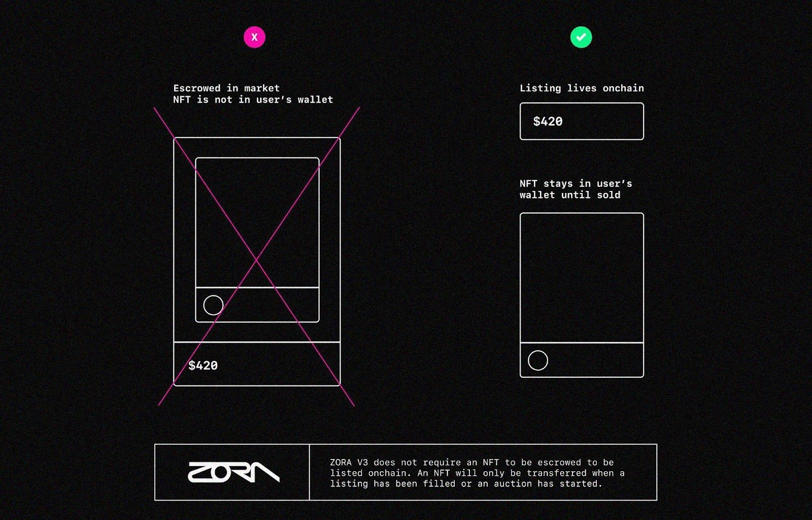 Additionally Zora V3 allows for non-custodial listings, meaning users can list NFTs onchain while maintaining them in their own wallets until they sell. This is in contrast to the V2 infrastructure, in which users would list NFTs by escrowing them in special “auction house” smart contracts.
