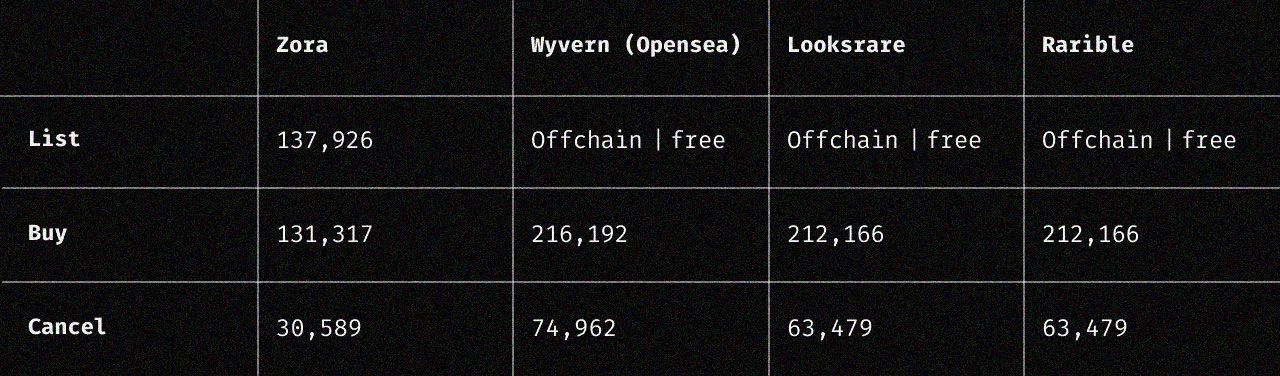 Gas efficient and builder-friendly: NFT marketplaces like OpenSea and Rarible offer “lazy minting,” or the ability to create NFTs for free. Lazy minting is made possible by offchain databases, so Zora’s too onchain to match here. But where Zora V3 does make considerable gas-efficiency strides over its peers is in buys and listing cancels, as you can see in the gas limit comparisons below.